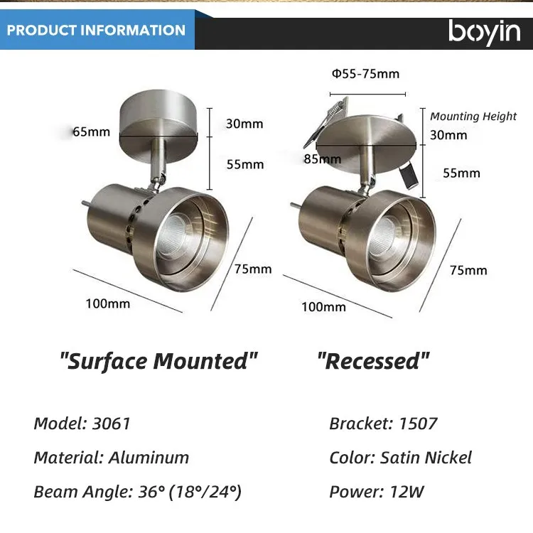 Products Description ModelBG-3061RBG-3061SPower12W12WCut-out75mm—InstallationRecessedCeiling MountedMaterialAluminumLight Angle36°(18°/24°)CRI90 →You can click here to send inquiry for more produt...